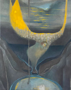 These oil paintings are part of a most recent series depicting a strong asian influence in composition and imagery. This series reveals a sense of prayer or contemplation interconnected with natural elements. A forward movement of strength is seen in the figurative leg at the center of each painting with the action of contemplation happening at the knee joint--a symbolic location; a physical point of heavy burden.